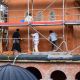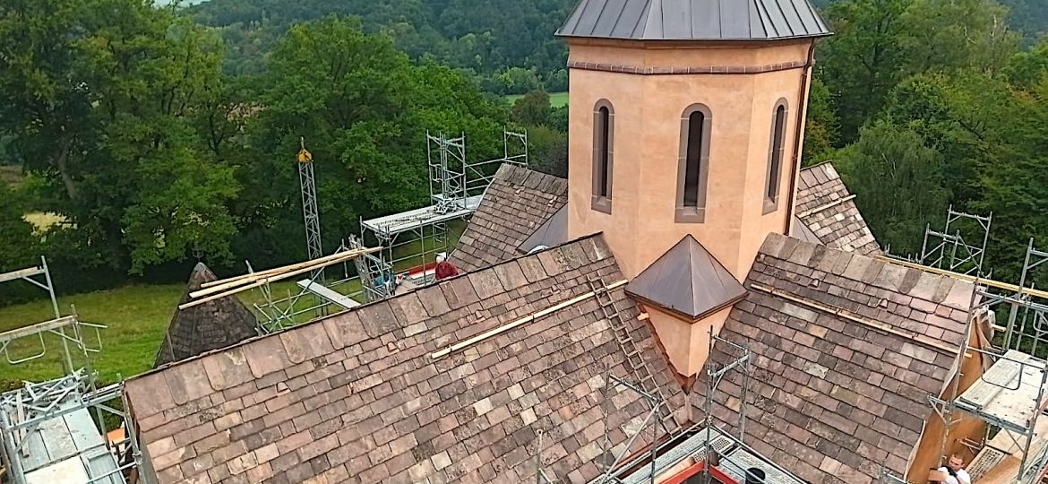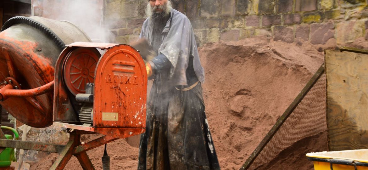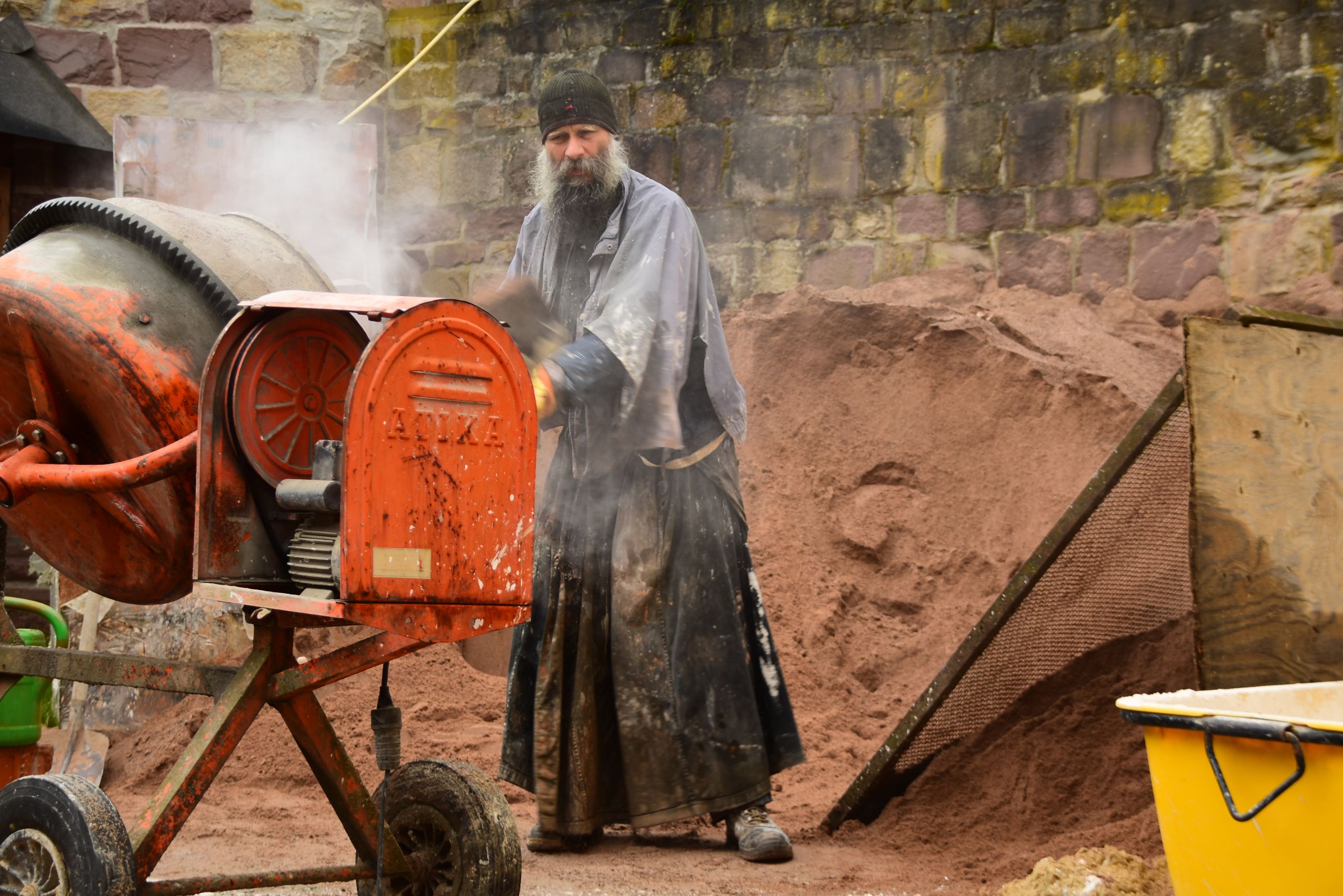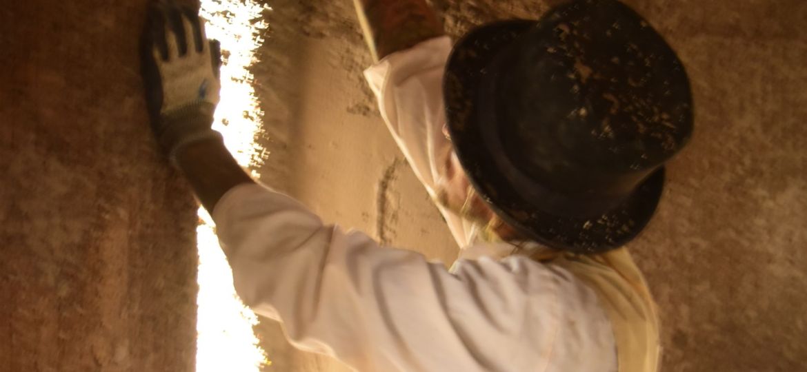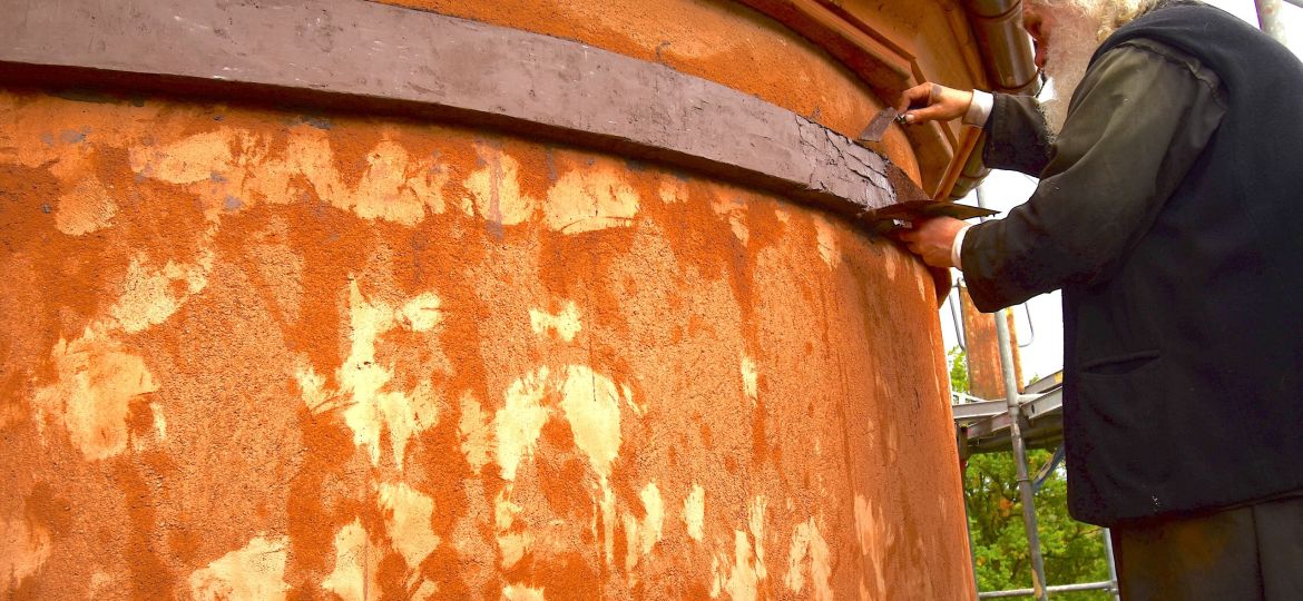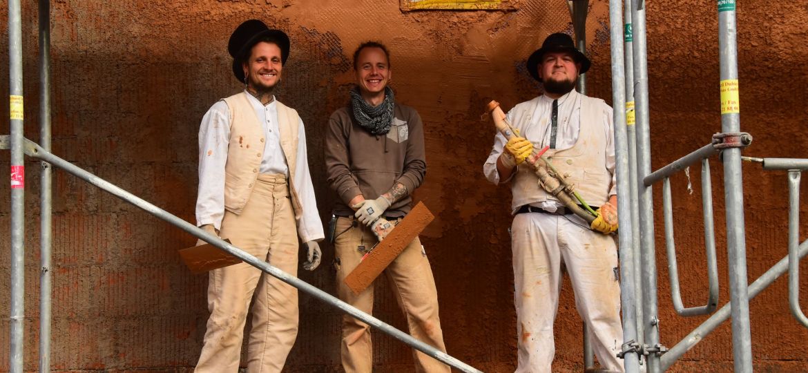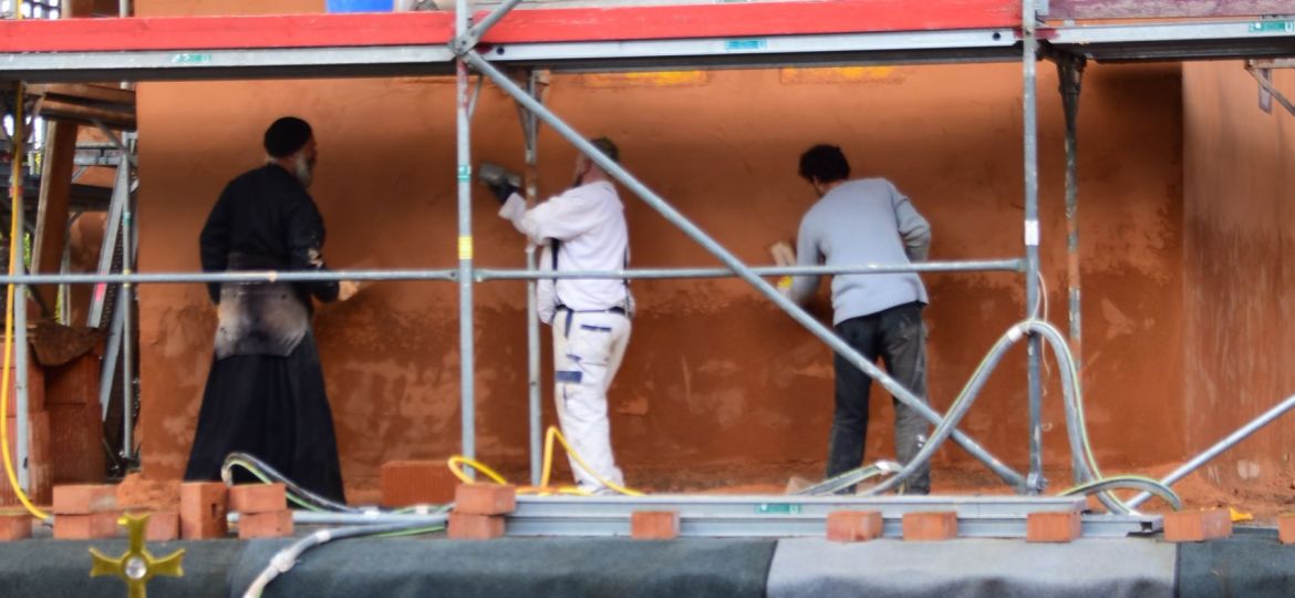 Nachdem Dachdecker und Spengler ihr Werk vollendet, besorgten wir im September eine Mörtelpumpe und gingen mit den Wandergesellen Fabian I. und Fabian II. sowie Benjamin dem Einheimischen an den Verputz. Für außen mischen wir das Pigment Eisenoxyd orange in den Speis; das Kircheninnere wird vorerst in reinem Kalkputz gehalten.